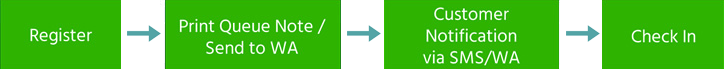 Operator Melakukan registrasi dengan memasukan data pelanggan ke aplikasi antara lain Nama,Nomor Ponsel, Jumlah Tamu dan kategori Antrian (Misalnya Dine-in, Takeaway, Meja 2-4 orang, Ruang VIP dan sebagainya).
